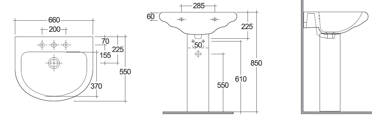 Lavabo sospeso monoforo da 65cm. Può essere completato con colonna. Con troppopieno. Fissaggi inclusi.