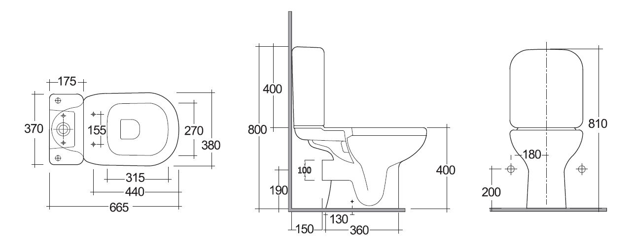 Vaso monoblocco con scarico a parete. Fissaggi laterali. Con apertura posteriore. Fissaggi inclusi.