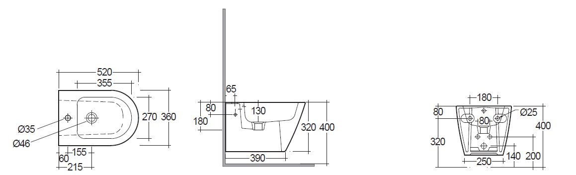 Bidet sospeso monoforo. Fissaggi laterali. Fissaggi inclusi.