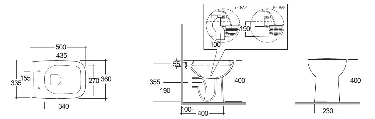 Vaso corto filo muro scarico universale, fissaggi laterali. Fissaggi inclusi. Curva tecnica ad “S” per scarico a pavimento inclusa.