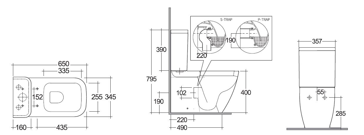 Vaso monoblocco filo muro, scarico universale. Fissaggi laterali. Fissaggi inclusi. Curva tecnica ad “S” per scarico a pavimento inclusa.