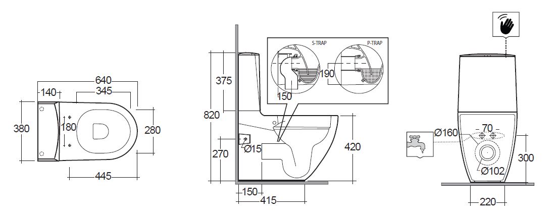 Vaso monoblocco filo muro Rimless, scarico universale. Fissaggi nascosti. Fissaggi inclusi. Curva tecnica ad “S” per scarico a pavimento inclusa.